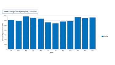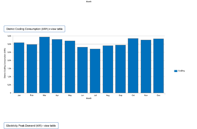 The simulation highlights how cooling demand and electricity use behave across the year, with relatively consistent monthly patterns. It also shows a stable peak demand profile, useful for early HVAC capacity planning and for comparing design options (equipment efficiency, lighting loads, and envelope improvements).