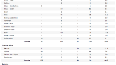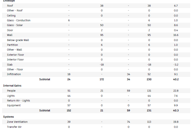 At peak conditions, the bathroom zone shows a 573 W cooling load. The main drivers are envelope heat gains (~40%), internal gains (people, lights, equipment ~40%), and ventilation/outdoor air (~20%). This helps size the local cooling strategy and refine openings, shading, and ventilation rates.