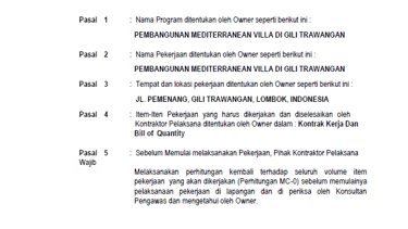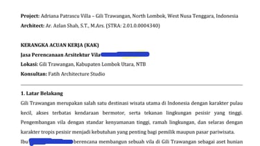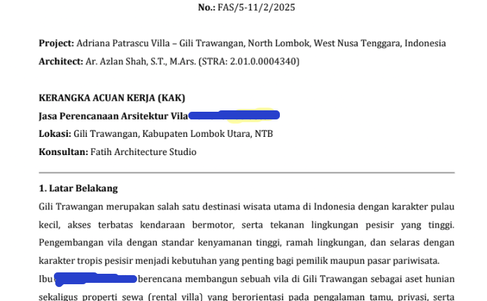 This page is part of the RKS (work plan & technical requirements) used to align the owner, contractor, and site supervision. It defines the project identity, location, and key obligations before construction starts—especially measurement checks, approvals, and execution rules by Fatih Arch Studio for the villa in Gili Trawangan.